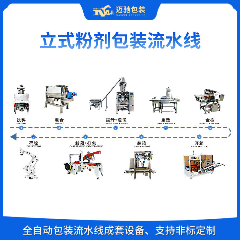 邁馳,是一家專業生產全自動粉劑包裝流水線的生產廠家,無揚塵、高精度,可包裝粉劑末、粉體、粉料等物料進行包裝,可根據物料不同特性定制包裝流水線設備,一對一定制化服務,26年包裝行業經驗助力生產企業將本增效,提高產能。